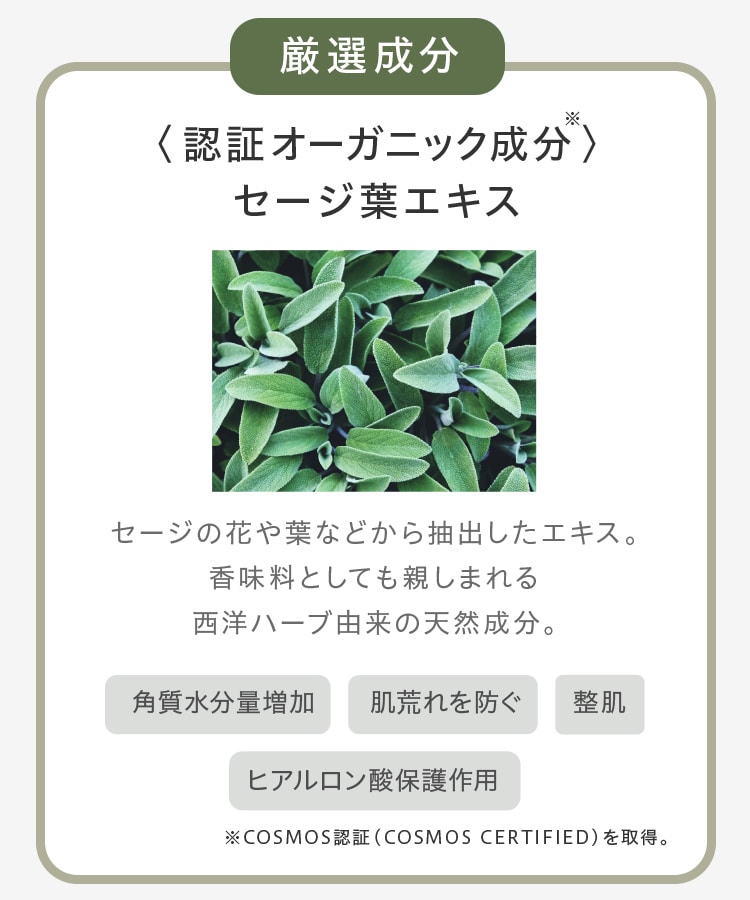 水、BG、パルミチン酸エチルヘキシル、エチルヘキサン酸セチル、ヤシ油脂肪酸PEG-7グリセリル、フランスカイガンショウ樹皮エキス、乳酸桿菌/ブドウ果汁発酵液、マンダリンオレンジ果皮エキス、加水分解コラーゲン、セージ葉エキス、アロエベラ葉エキス、シロツメクサエキス、ヒアルロン酸Na、パルマローザ油、レモン果皮油、イランイラン花油、コリアンダー果実油、ニオイテンジクアオイ油、チョウジ芽油、トウシキミ果実/種子油、カルボマー、(アクリレーツ/アクリル酸アルキル(C10-30)クロスポリマー、ジラウロイルグルタミン酸リシンNa、水酸化Na、ペンテト酸5Na、炭酸水素Na、白金、フェノキシエタノール