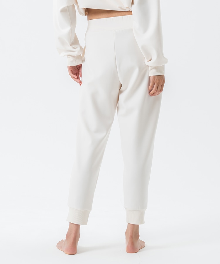 すっきりシルエットのジョガーパンツ。上品な光沢感と滑らかな風合いのダンボールニット生地を使用。