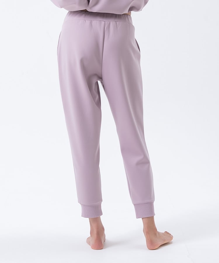 すっきりシルエットのジョガーパンツ。上品な光沢感と滑らかな風合いのダンボールニット生地を使用。