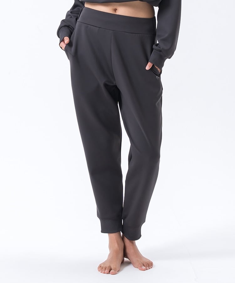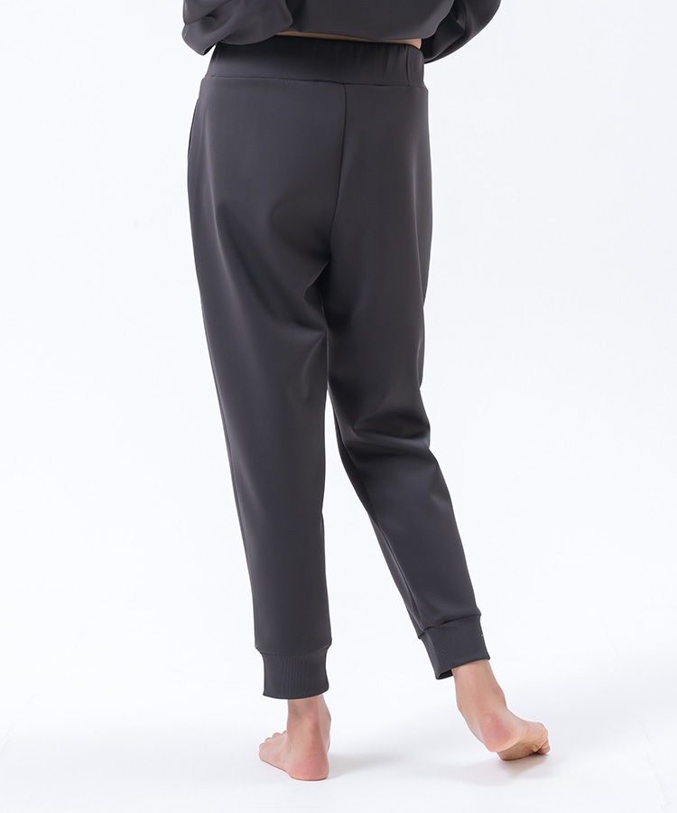 すっきりシルエットのジョガーパンツ。上品な光沢感と滑らかな風合いのダンボールニット生地を使用。