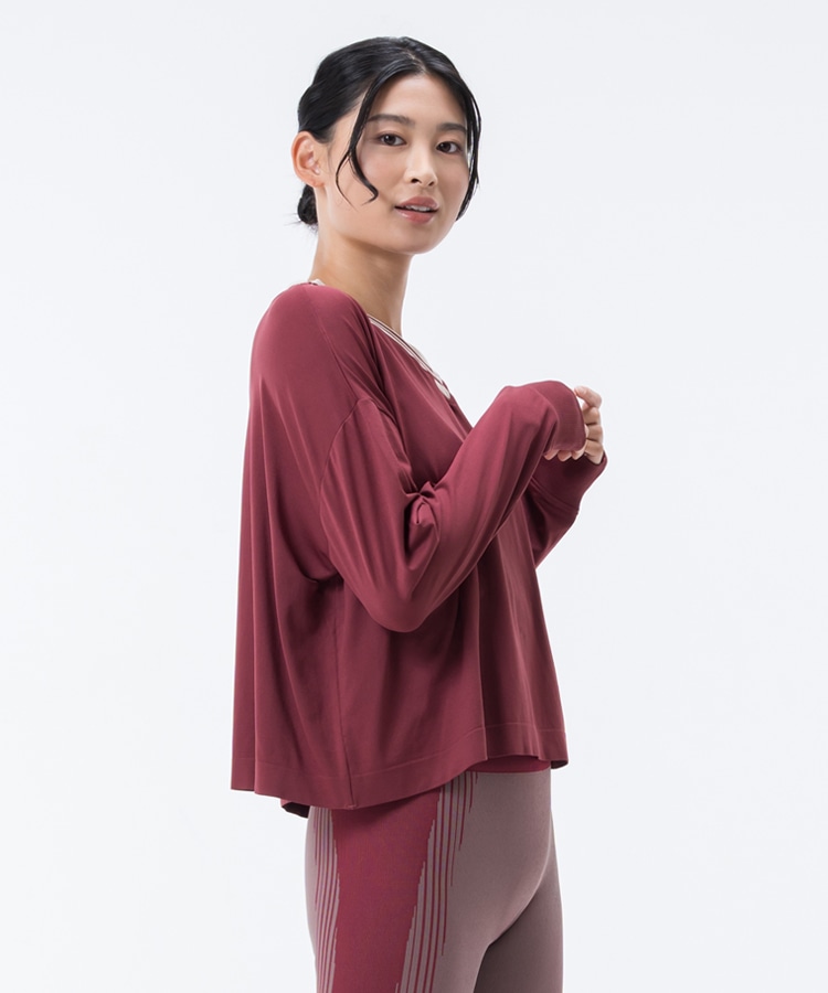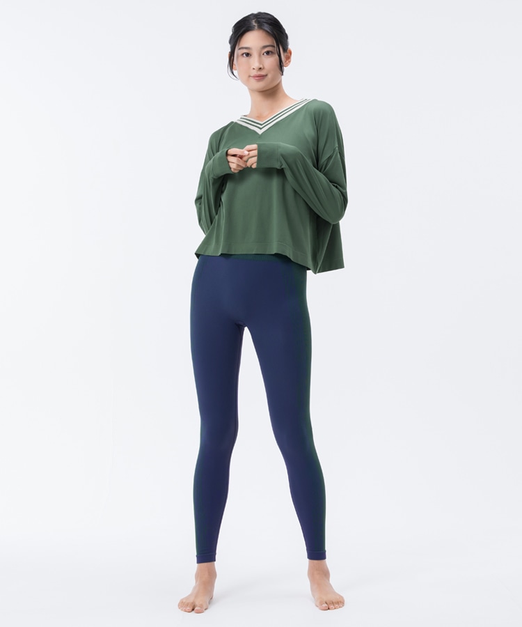 レトロな色合いのアンサンブルのセットアイテム。大きく開いたVネックは着替え易い上に、デコルテも綺麗に見せてくれます。