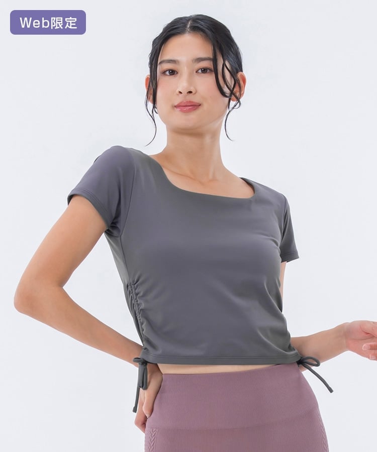 スクエアネックがデコルテを美しく見せてくれる、半袖トップス。サイドに施したギャザーはお好みで調節でき、シルエットの変化を楽しめます。