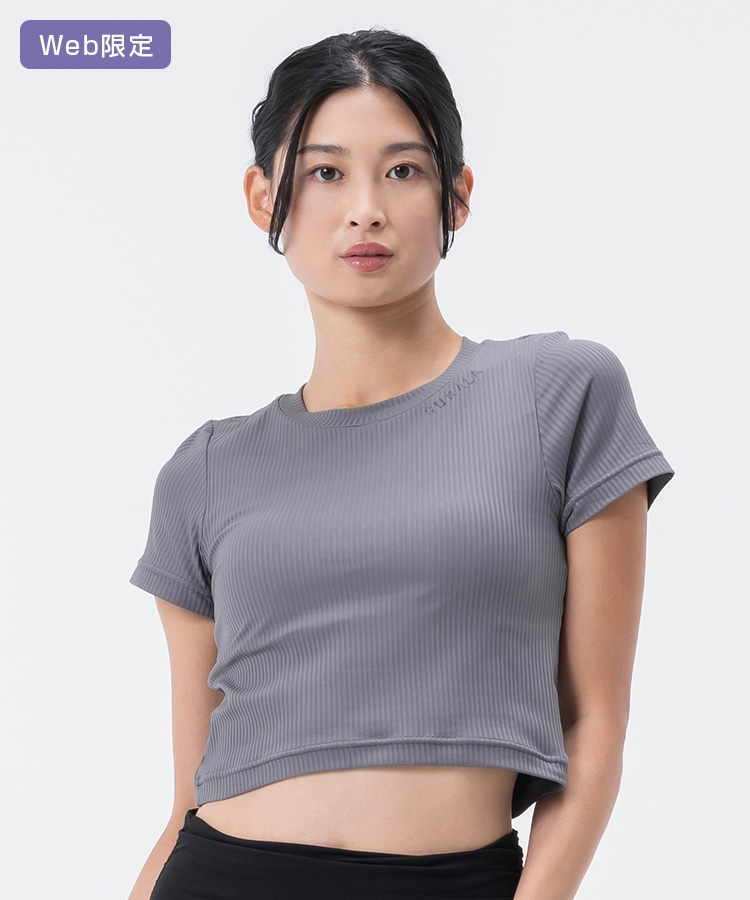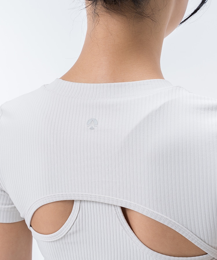 カップ付きのコンパクトシルエットTシャツ。後のヘルシーな肌見せベンチレーションがポイント。