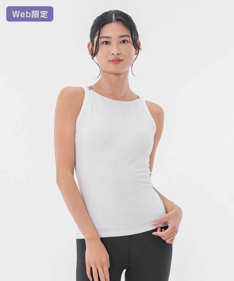 存在感のあるSUKALAロゴストラップと、リブ素材を使用したタンクトップの組み合わせがワンランク上のオシャレな印象に。