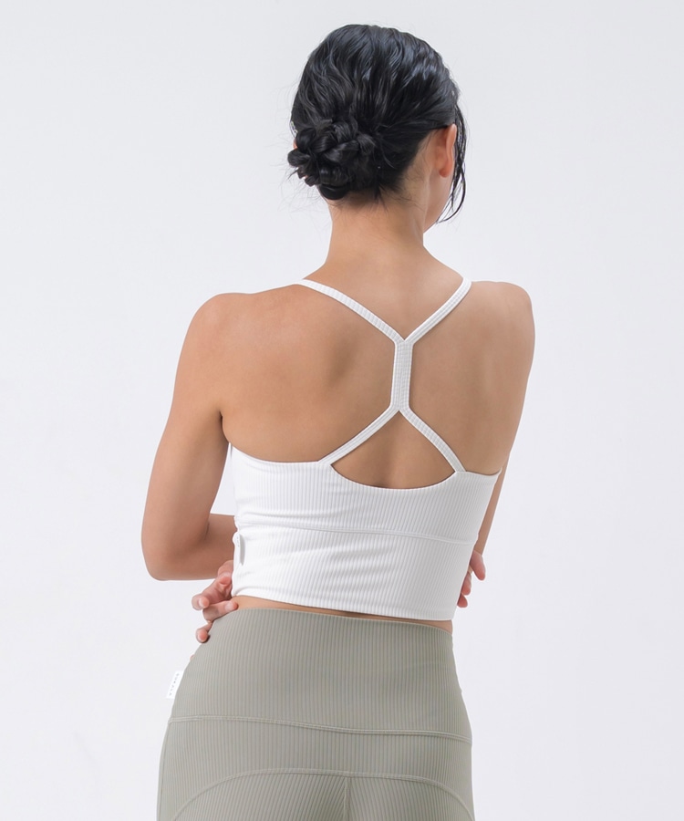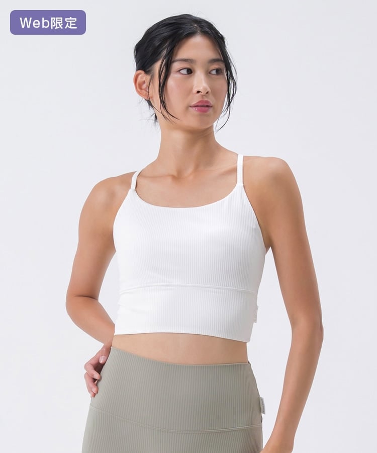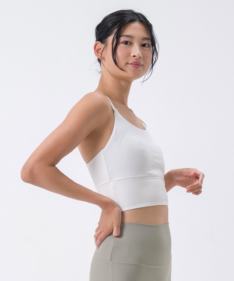 高い伸縮性と形状維持性を持ち、身体の動きをサポートしてくれるライクラ®を贅沢に23%使用したリブ素材のブラトップ。