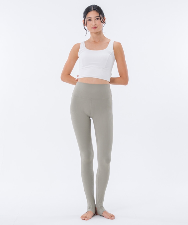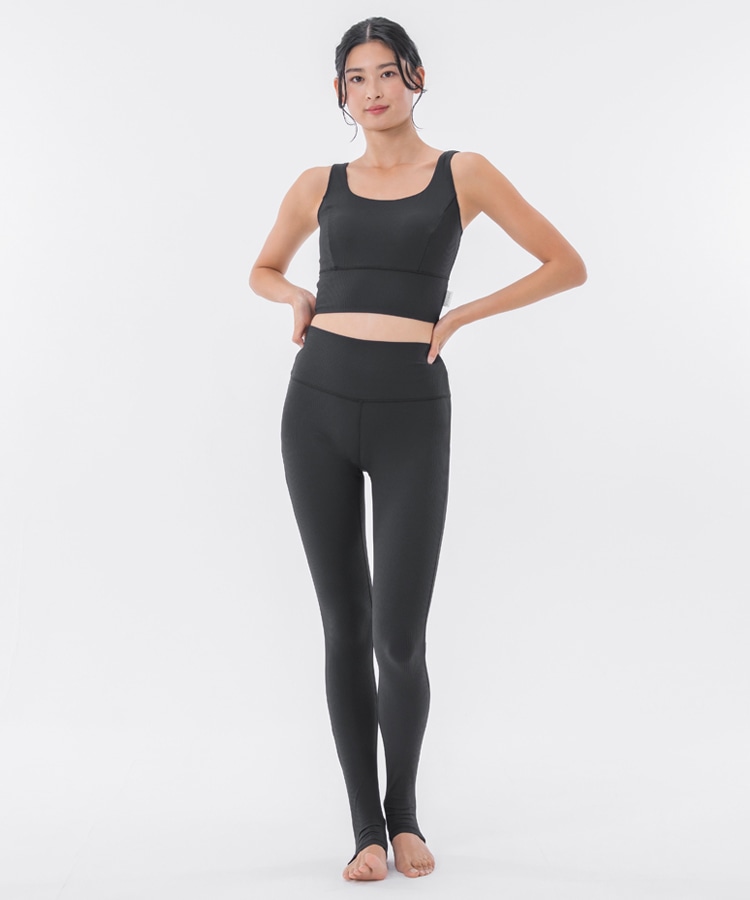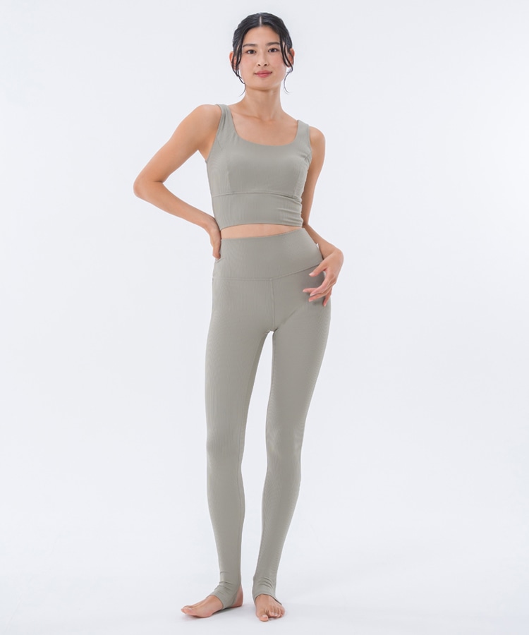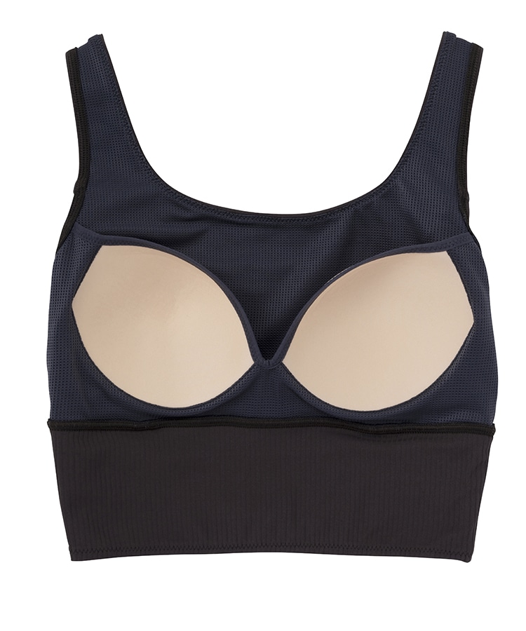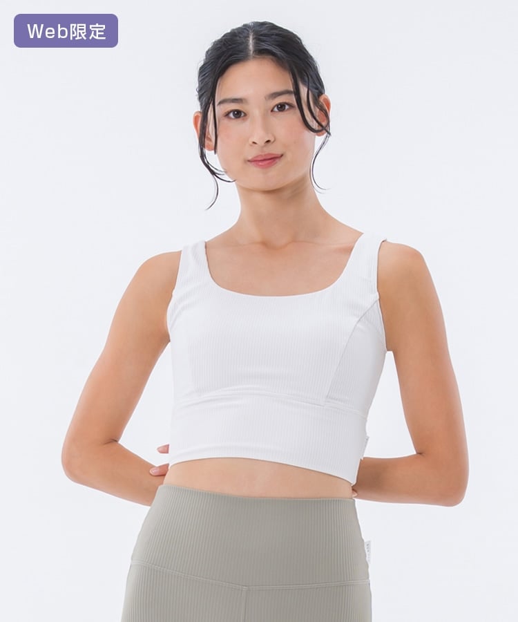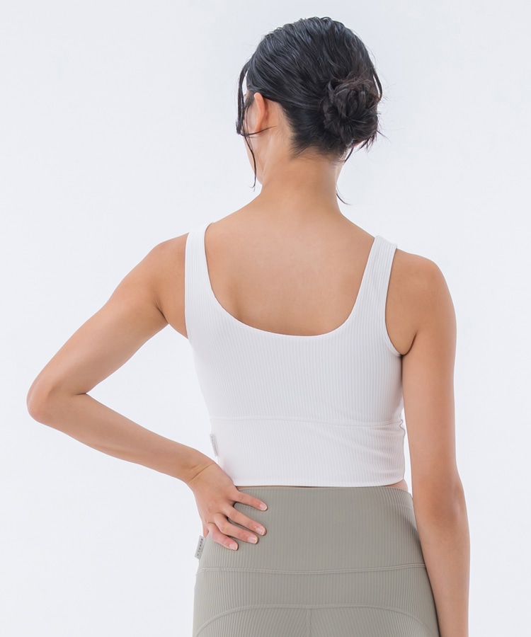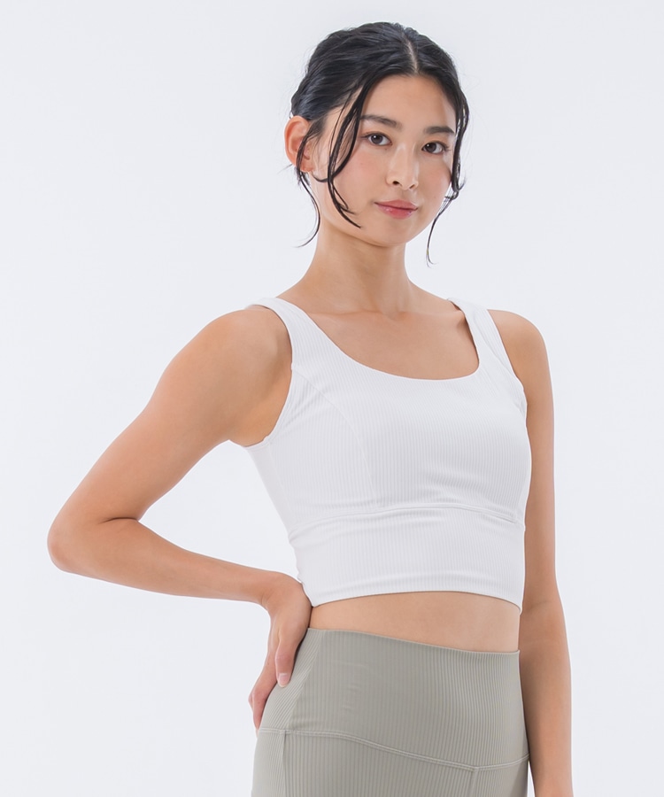 高い伸縮性と形状維持性を持ち、身体の動きをサポートしてくれるライクラ®を贅沢に23%使用したリブ素材のブラトップ。