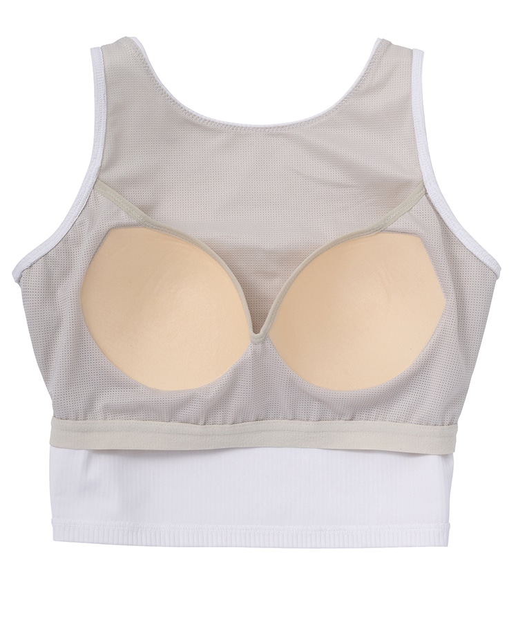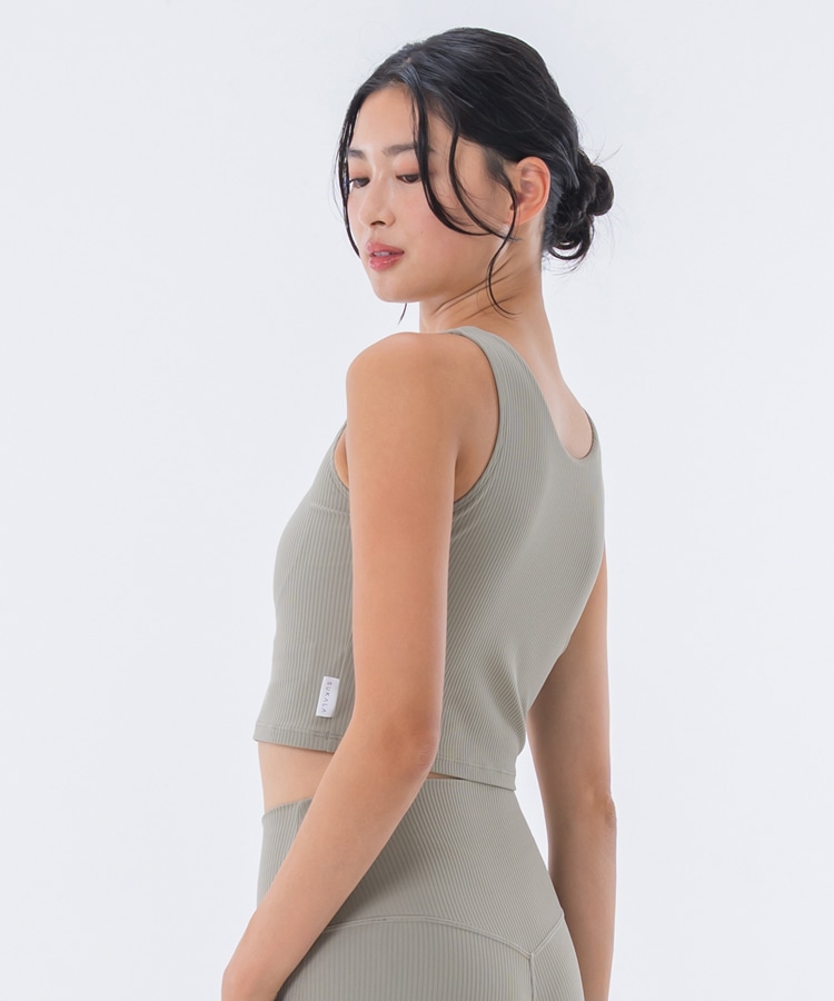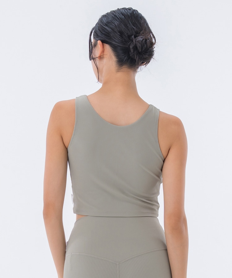 高い伸縮性と形状維持性を持ち、身体の動きをサポートしてくれるライクラ®を贅沢に23%使用したリブ素材のショートタンクトップ。