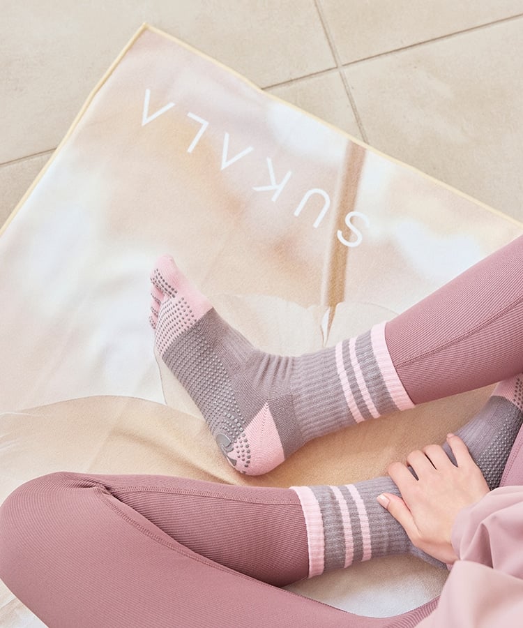 ヨガ中のずれあがりを防ぐため、裏面全体にシリコン付き。膝をついても痛くないよう小さめにドットを設計しています。
