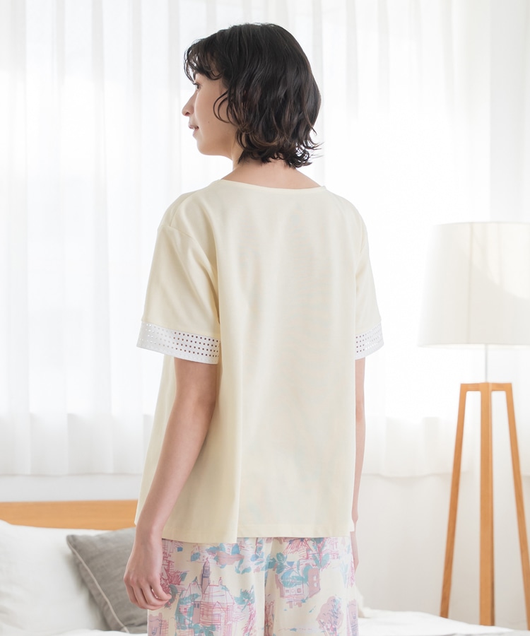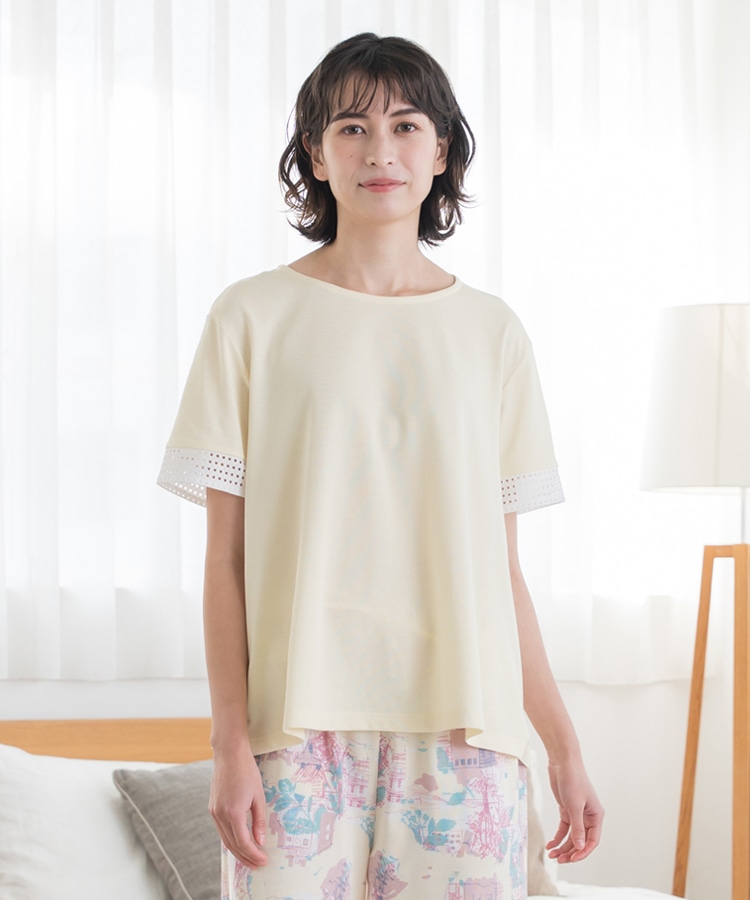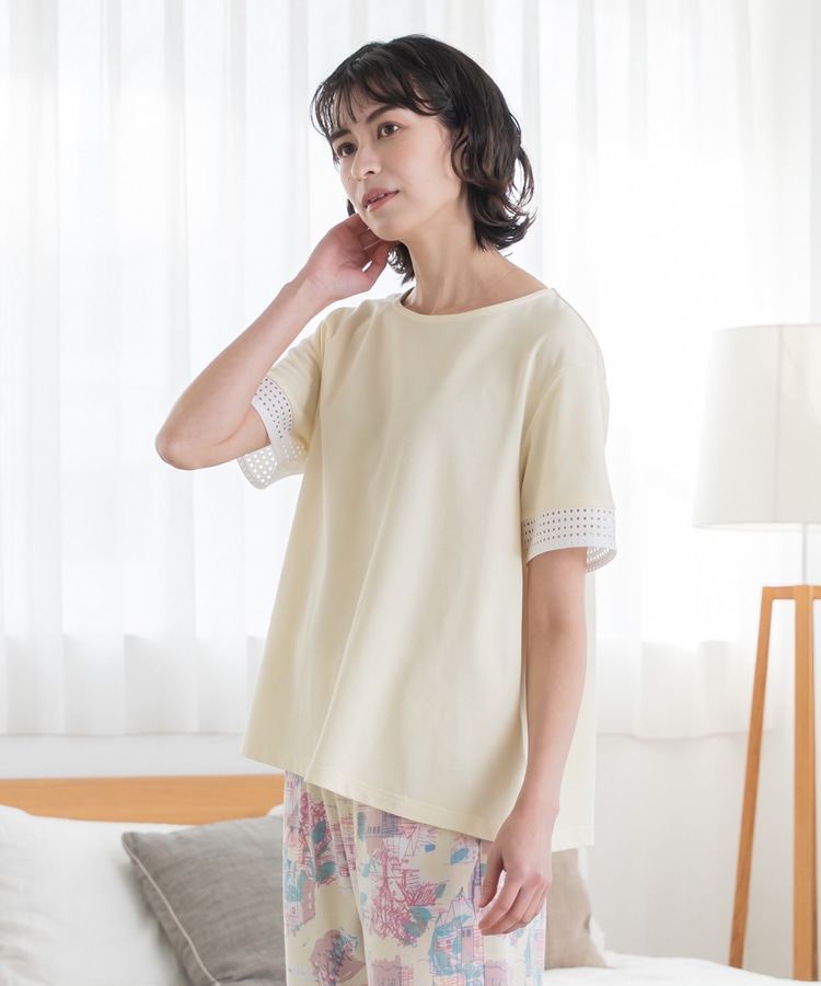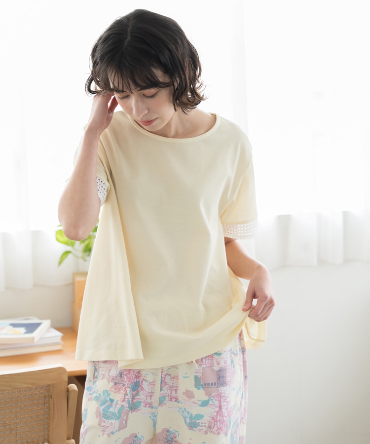 トップスは、身体のラインを拾いすぎない程よいAラインシルエットに、袖口のレースがさりげないアクセントを添えます。