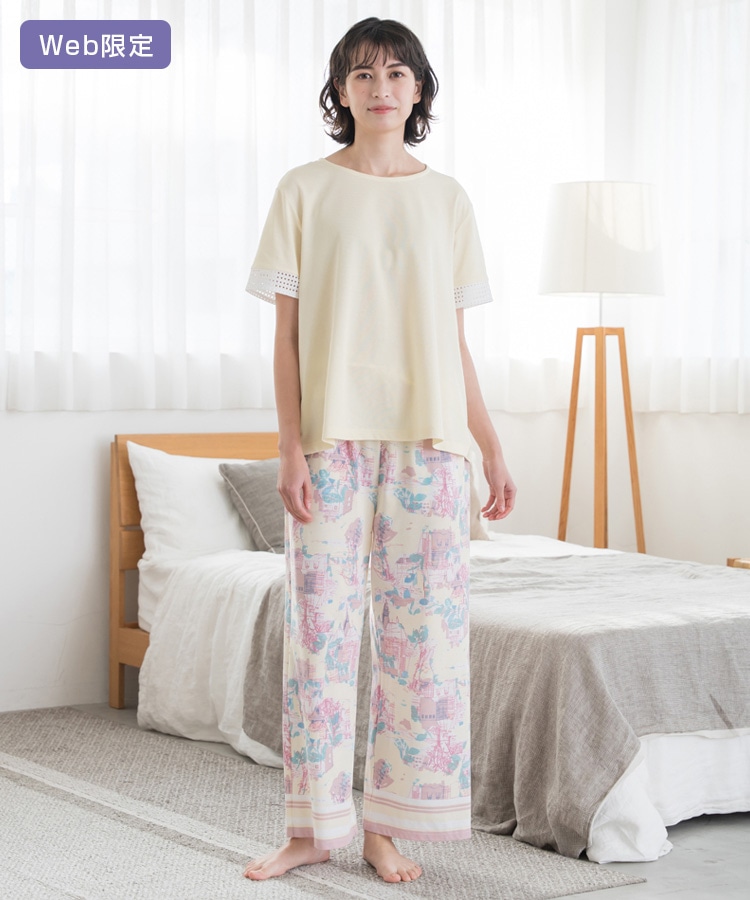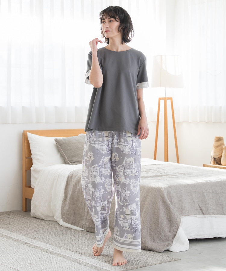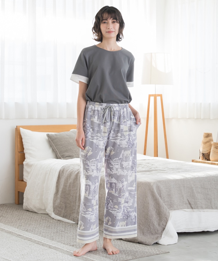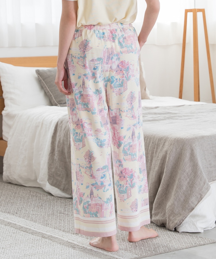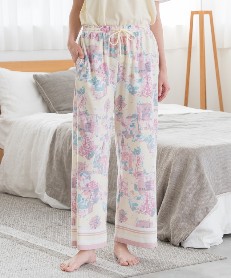 ボトムは、裾にあしらったボーダー柄のパネルプリントがポイント。