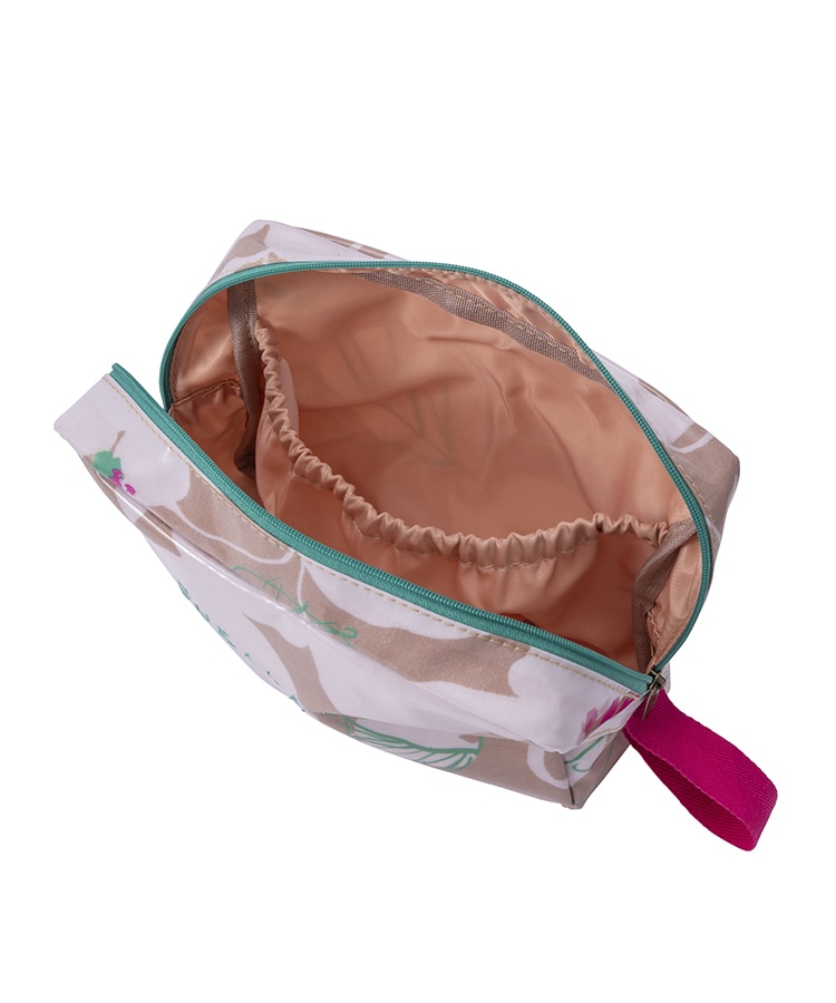 ルームウェアとお揃いの柄をラミネート加工したスクエアポーチ。