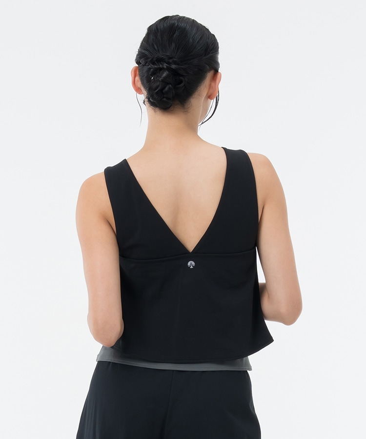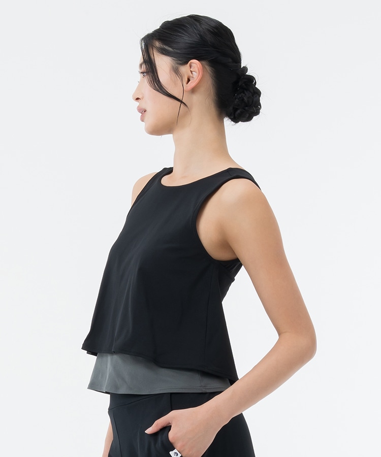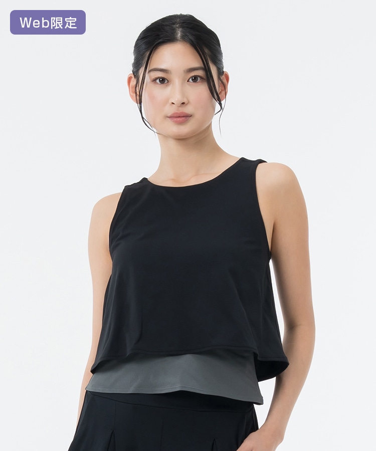 スタイルUP効果大。シンプルでありながらレイヤードデザインが効いたショート丈のタンクトップは、色使いがポイント。