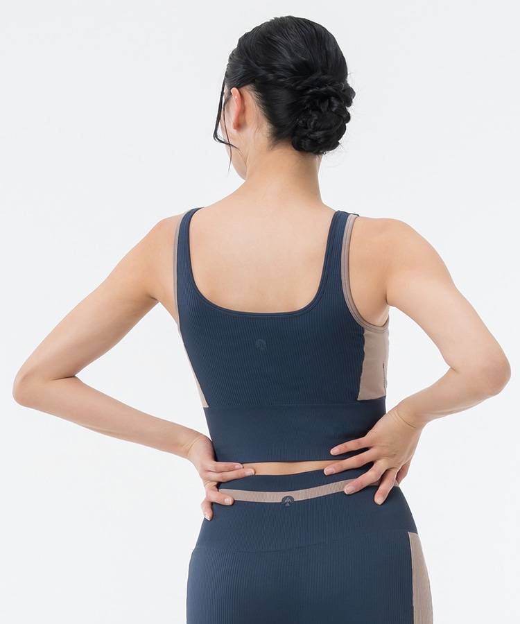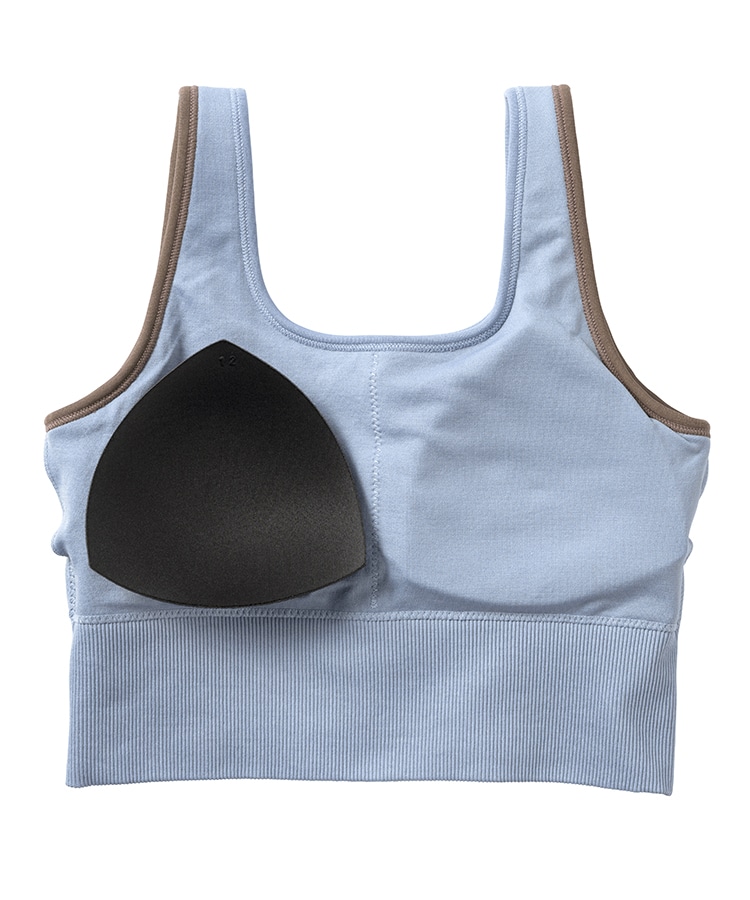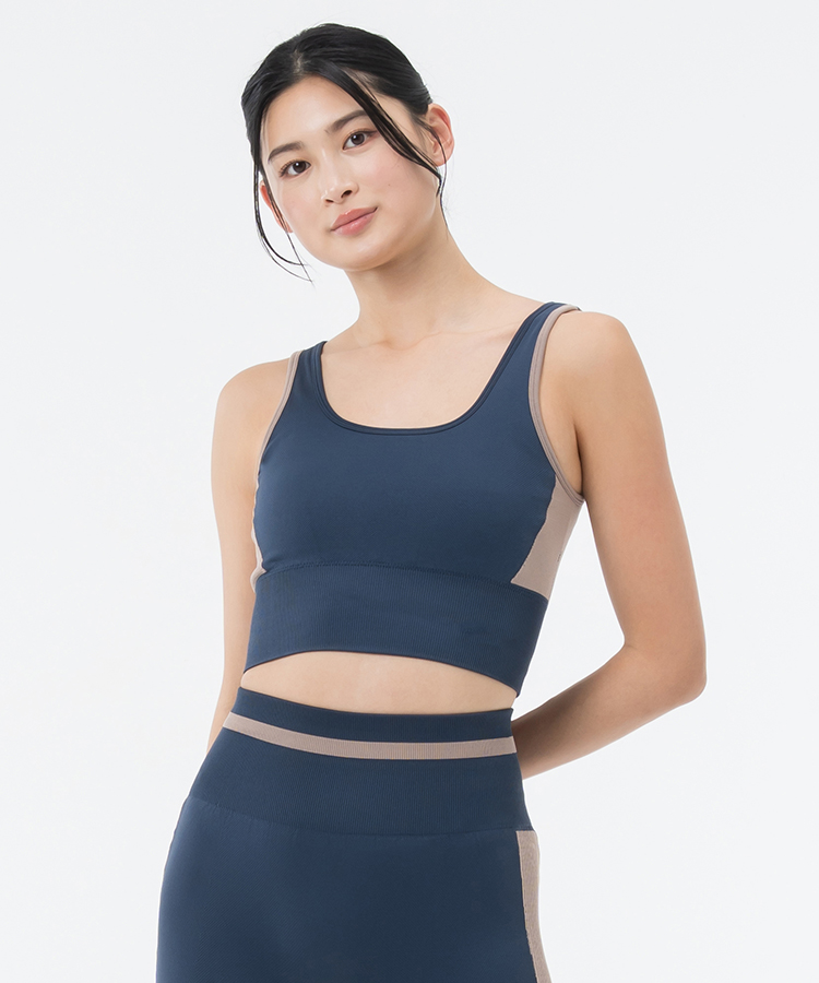 カラーコンビネーションが新鮮な、スクエアネックデザインのブラトップ。縫い目が少なく軽やかな着心地