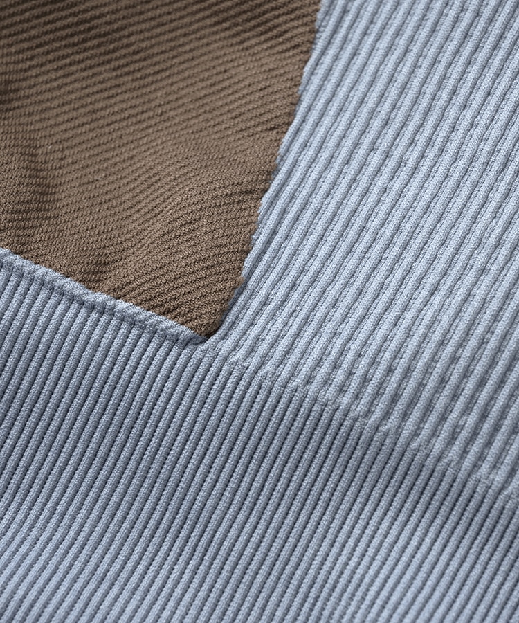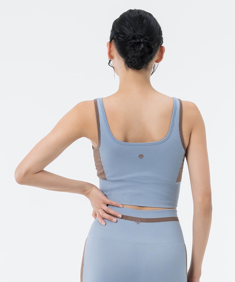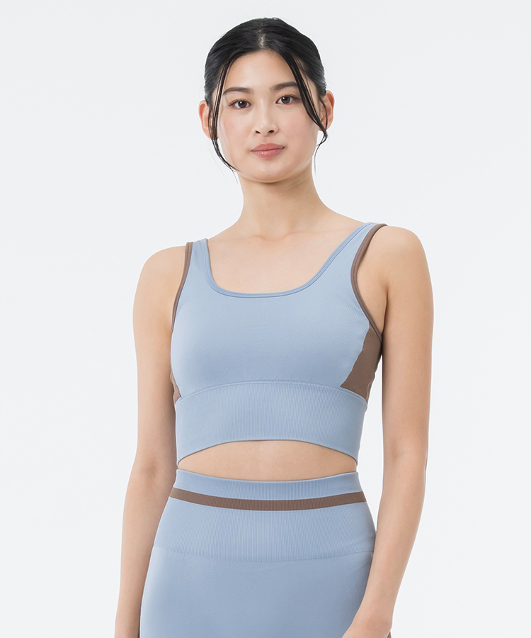 カラーコンビネーションが新鮮な、スクエアネックデザインのブラトップ。縫い目が少なく軽やかな着心地