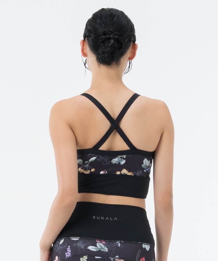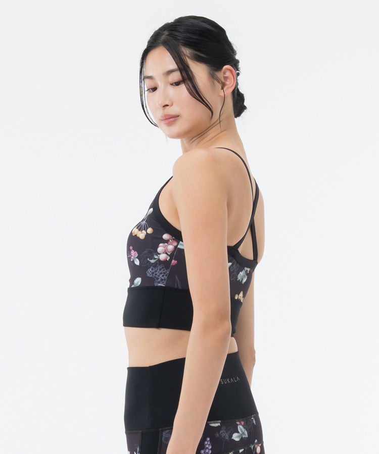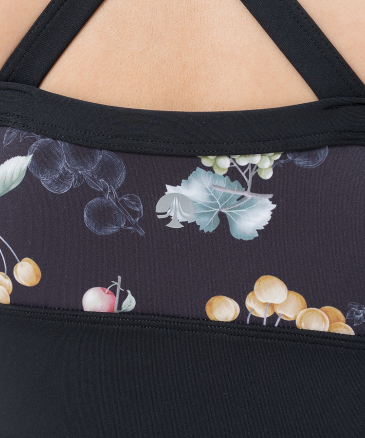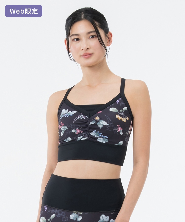 様々なフルーツがプリントされたブラトップは、胸元のギャザーと配色の無地切り替えがスタイルアップのポイント。