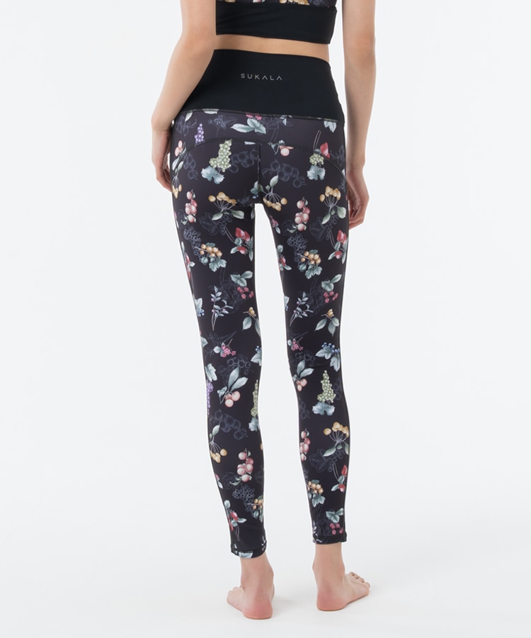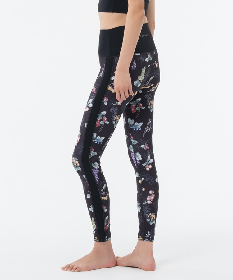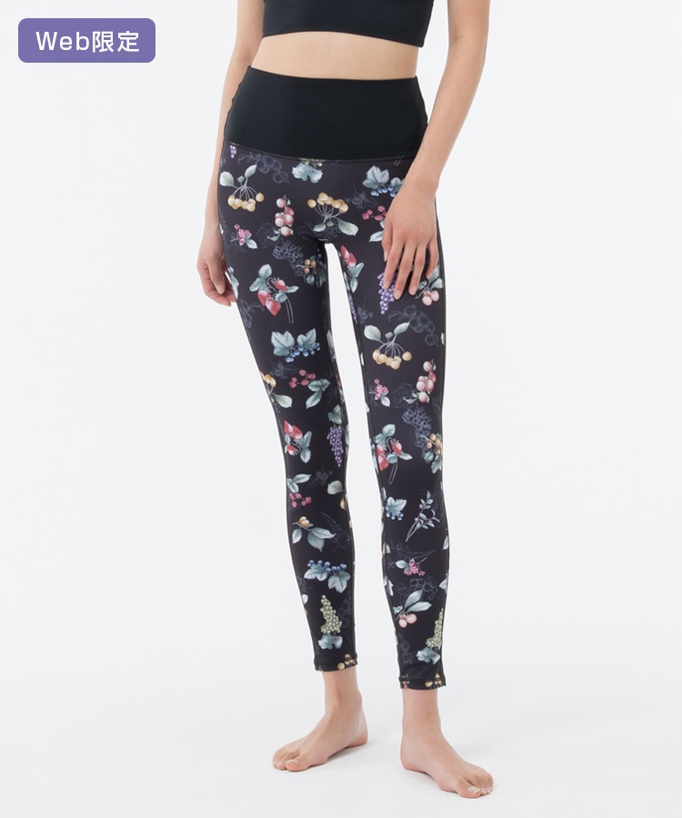 様々なフルーツがプリントされたハイウエストレギンスは、ウエスト部分との無地切り替えとサイドラインがスタイルアップのポイント。
